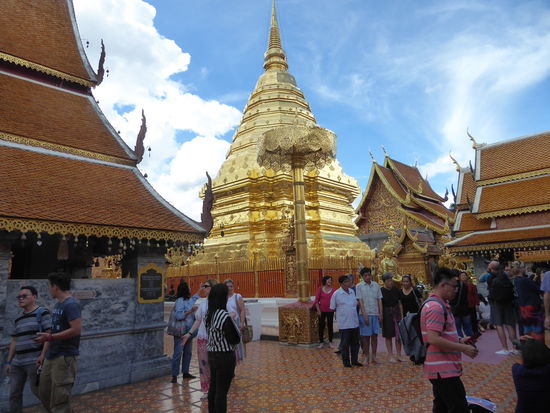 Der Wat Phra That Doi Suthep, so heisst die Pagode ist nicht nur ein Touristenmagnet, sondern auch ein Anziehungspunkt für viele Pilger aus dem ganzen Land. Sie huldigen dem Buddha mit Geldspenden und legen Lotusblüten nieder. Oder sie pilgern mit Blumen in der Hand rund um den Chedi, die riesige Pyramide in der Mitte. Einige lassen sich von einem Mönch in der Pagode beim riesigen Buddha segnen. Er bespritzt sie mit Wasser und murmelt ein Gebet.