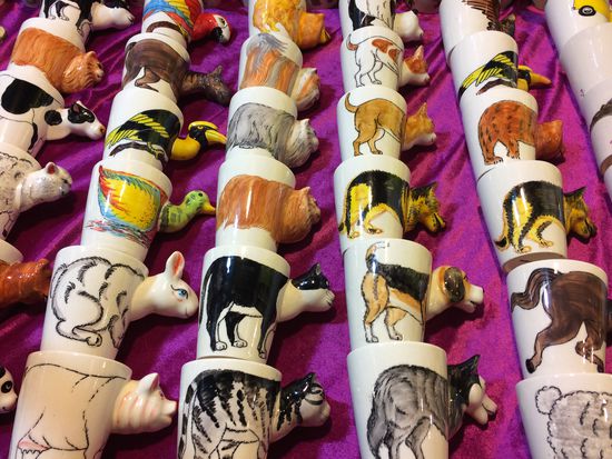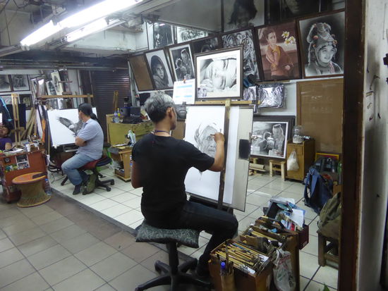 Es gibt sehr viel schöne Handarbeiten. Holzschnitzereien, Metallarbeiten, Schmucksteine. Aber auch kleine Kostbarkeiten wie die handgeschnitzten und kolorierten Seifen in den schönen Dosen. Skuriles wie die Tassen mit Tiermotiven. Tolle Bilder und Zeichnungskünstler, die von einer Foto ein realistisches Bild zeichnen. Und natürlich endlos Kleider, Handtaschen, Schuhe.