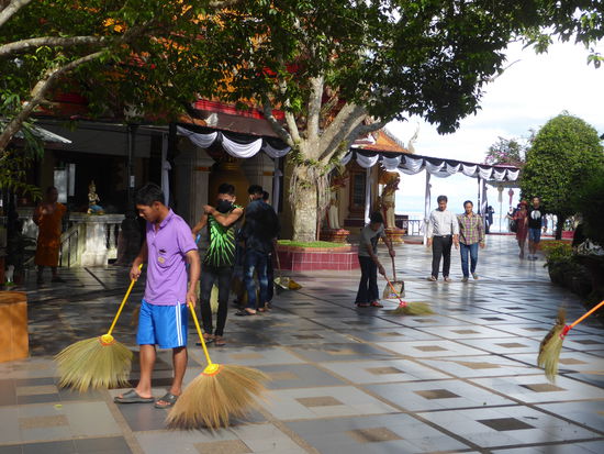 Auf dem Weg zum Aussichtspunkt begegne ich ein paar Burschen. Unter der strengen Aufsicht eines Mönchs wischen sie den Boden. Sie schwenken dabei ihre Besen und verteilen, was auch immer sich auf dem Boden befindet in alle Winde. Einer versucht dann, ein paar Blätter mit seiner Schaufel aufzufangen. Es ist offensichtlich, dass das Resultat nicht passt und so schimpft denn der Mönch hinter ihnen her.