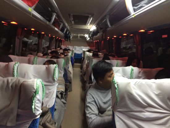 Es gibt noch zwei weitere Haltestellen, wir sind immer noch in der Stadt, doch dann geht es aufs Land. Draussen wird es dunkel, die Strasse holpert. Ja die holpert sogar richtig stark, möchte gern sehen, wie die aussieht. Doch von Platz 31 sieht man nicht nach vorne und in den Seitenscheiben spiegeln sich nur die Sitze im Innern des Busses wieder. Um Elf gibt es einen weiteren Halt, einige Leute steigen aus. Vielleicht eine Raststätte, ich gehe nach vorn. Wie lange? Er streckt drei Finger in die Höhe, zeigt nach rechts: Toiletten.