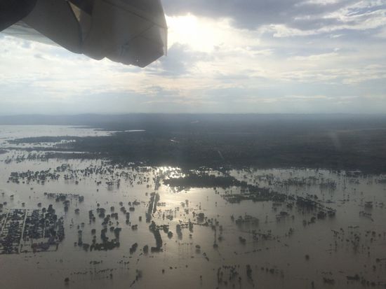 Und dann verbreitet sich der Fluss plötzlich, wird zu einer weiten Wasserebene. Mit überspülten Inseln mitten drin. Auf denen Häuser stehen. Ist das normal? Ist das die Regenzeit? oder ist das Wasser höher, als normal? Gleich darauf fliegen wir wieder über trockenes Land. Es ist eine eindrückliche Landschaft. Die Menschen leben wohl mit diesen wechselnden Verhältnissen. Wasser ist Leben und Verderben. Eine lange Brücke spannt sich über den ganzen Fluss, die Sonne steht schon tief du sendet ihre Strahlen über das grosse Waser mit den Bäumen, Häusern und Strassen.