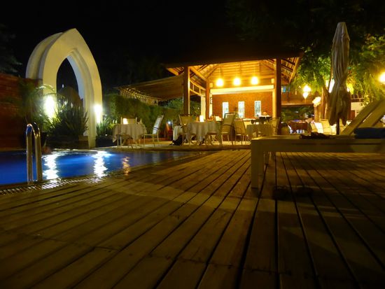 Wir kommen beim Hotel an. Das sieht genau so aus, wie ich es mir vorgestellt habe. Mit der grossen offenen Rezeptionshalle mit den niedrigen bequemen Möbeln aus schwerem Holz, der grossen geschnitzten Theke, den netten Angestellten und dem Pool gleich daneben.