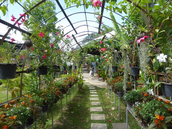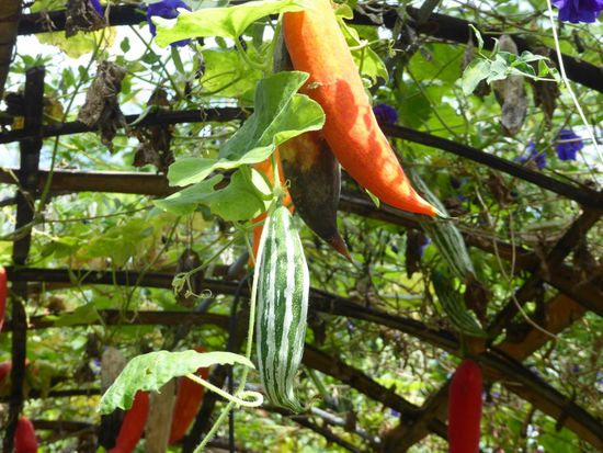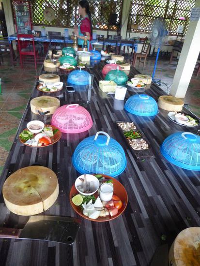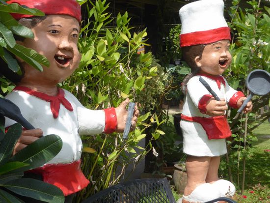 Wir fahren weiter und kommen in einem Aussenbezirk zur Kochschule. Sie liegt in einem sehr schönen Garten. Es gibt lauschige Plätze, Schaukeln, viele Blumen und statt Gartenzwerge lustige Figuren. Auch ein grosser Gemüsegarten gehört dazu. Es scheint, dass der Gemüsegarten zuerst existiert hat und dann hat eine innovative Person eine Kochschule eröffnet.