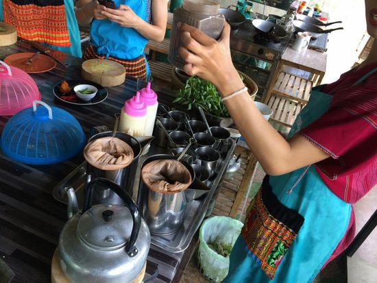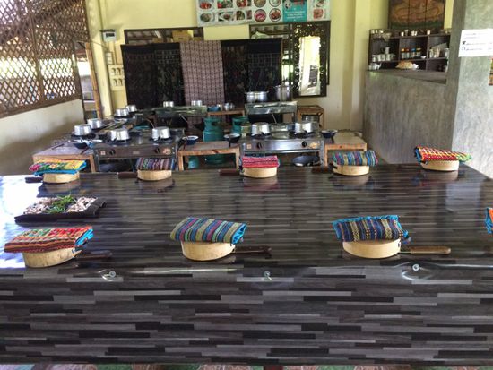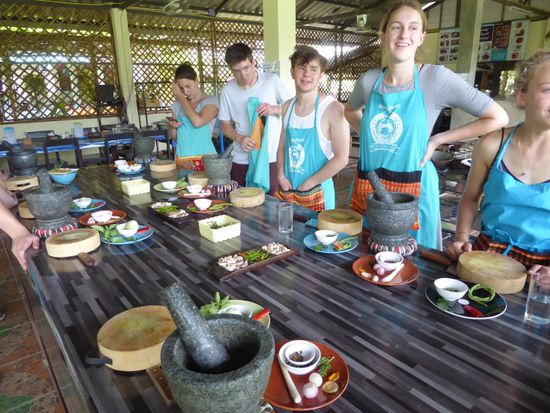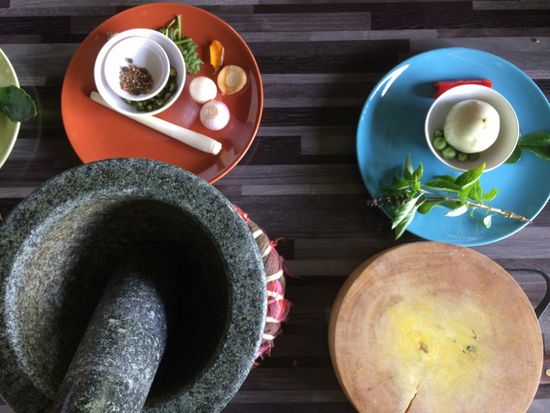 Inzwischen haben die Helfer grosse Mörser auf die Arbeitsplatte gestellt. Nach dem Essen wird eine Currypaste selber hergestellt.