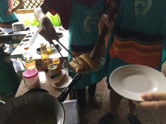 Nachdem wir uns gegenseitig vorgestellt haben, fassen wir alle eine Schürze und schon geht es los. Die Zutaten für die Frühlingsrollen stehen bei den Gasherden bereit.