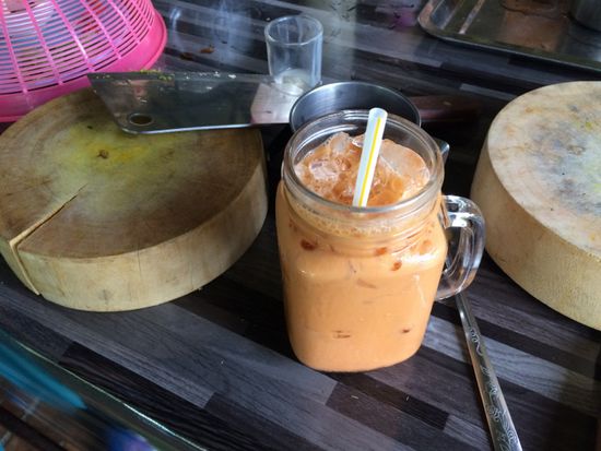 Jetzt machen wir erst einmal Teepause entscheidet Emi und braut einen starken Tee. Den mischen wir mit süsser Kondensmilch und schütten ihn in ein Glas voller Eiswürfel. Ein Strohhalb dazu und wir haben ein fantastisches Erfrischungsgetränk. Sündhaft süss. Kann fast als Dessert durchgehen.