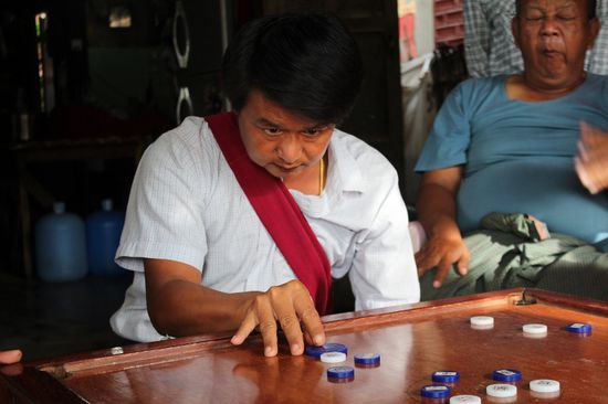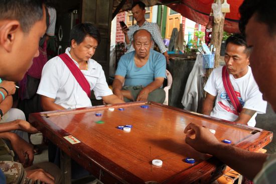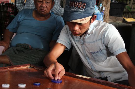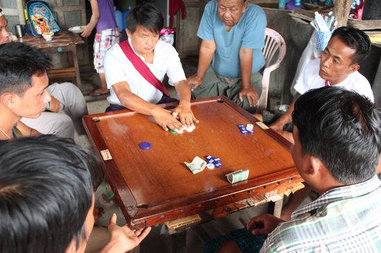 Einmal will einer wissen, woher ich komme, und ob ich allein hier sei, die üblichen Fragen, doch für weitere Fragen reicht der Wortschatz nicht. Es wird eh kaum gesprochen. Alle kauen bedächtig ihre Betelnüsse. Im Hintergrund läuft das Radio, einmal singt einer ein wenig mit, konzentriert sich dann aber sofort wieder auf das Spiel.