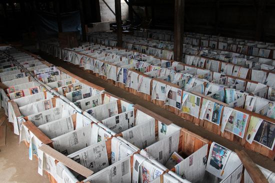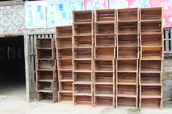 Danach werden sie in Kisten, die mit Zeitungspapier ausgelegt sind, geschichtet und vernagelt.