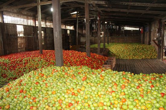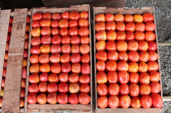 Bei einem Lager fährt bereits der Lastwagen vor. Die Tomatenkisten werden aufgeladen. Wohin fährt der Wagen?