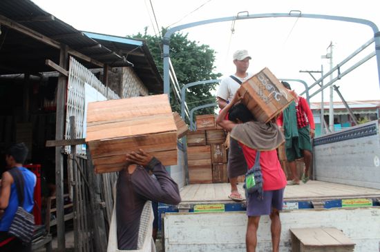 Ich spaziere weiter und entdecke eine grosse Lagerhalle, in der Tomatenkisten zugenagelt werden. Zuerst glaube ich, dass es eine Markthalle ist, merke aber schnell, dass es ein Tomatenlager ist. Hier werden die Tomaten sortiert. Es sind die Früchte, die vom See gebracht werden.