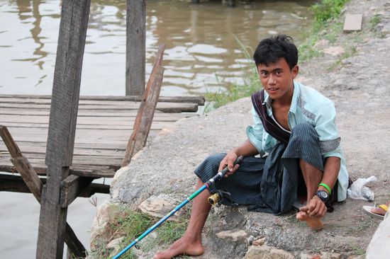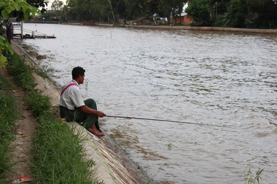 Beim Dorfausgang setze ich mich bei einer Bootsanlagestelle ans Ufer und schaue einem Fischer zu. Leider hat er kein Glück, an seiner einfachen Angel will sich kein Fisch verbeissen.