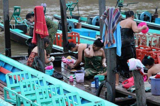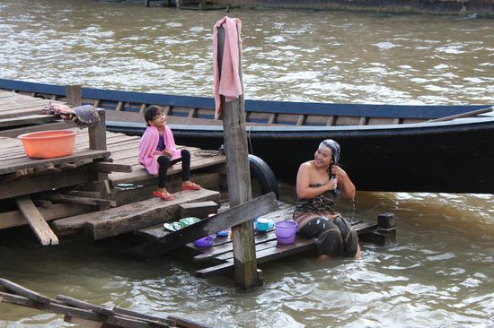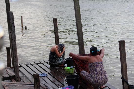 Und jetzt sehe ich, dass auch auf meiner Seite auf allen Schiffstegen Leute sind, die ihr tägliches Bad nehmen. Mädchen waschen ihre langen Haare. Sie haben sich ihre Rücke bis unter die Achseln gebunden und steigen ins Wasser.