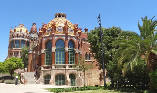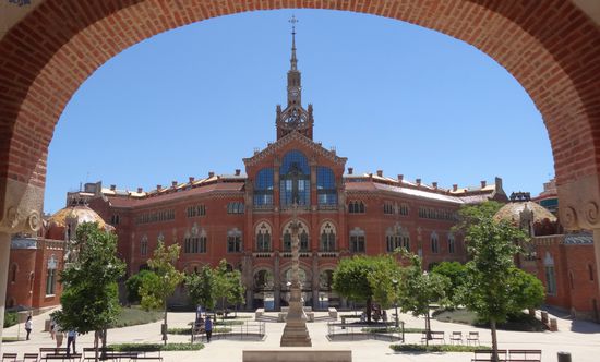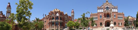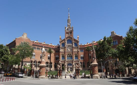 Diese Krankenhausanlage, die mit allen Gebäuden fast einen ganzen Block einnimmt, wurde zwar schon vor 600 Jahren gegründet, die Bauten in der jetzigen Form sind aber erst ab 1902 entstanden. Erschaffen wurde sie vom Architekten Lluis Domènech i Montaner, nach einer Zeit, da Spanien von der Pest heimgesucht wurde und man sich Gedanken über eine Verbesserung im Gesundheitswesen machen musste. Die Anlage wurde auf einem Gelände mit Gefälle angelegt, die "schlechte" wärmere Luft zog so automatisch aus den Krankensälen nach oben weg und die Menschen waren dadurch nicht zusätzlich belastet. Auch Gaudi ist in diesem Krankenhaus nach seinem Unfall verstorben. Von den insgesamt 12 Gebäuden sind bereits 8 wieder fertiggestellt. Für Besucher ist eine Besichtigung erst ab Ende 2014 möglich. Von der UNESCO wurde der Komplex im Jahre 1997 zum Weltkulturerbe ernannt.