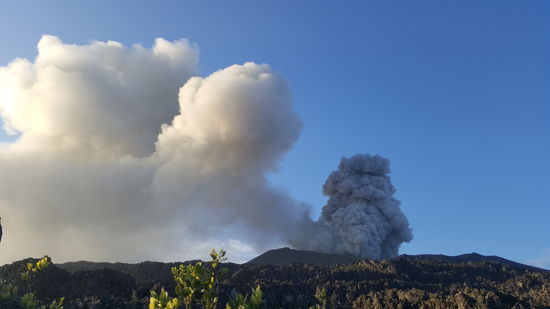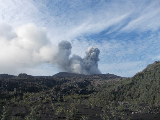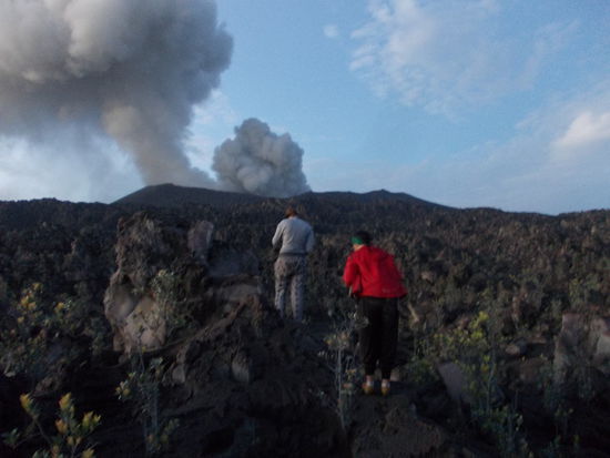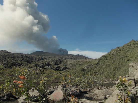 Wir gehen jetzt über das ausgetrocknete Flußbett und die Lavageröll bis auf 400m an den tobenden Vulkan dran.