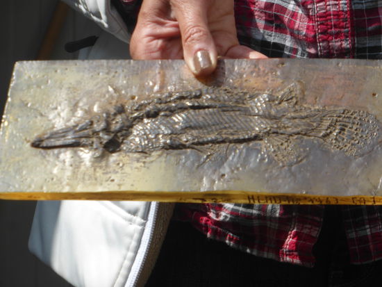 Replik der A- und B-Platte des bedeutendsten Primatenfundes aus Messel: Darwinius masillae, auch bekannt als .Ida". Das weibliche Tier war noch nicht ausgewachsen als es in den See stürzte. Die Erhaltung der Knochen, Zähne, des Mageninhalts und des Fellumrisses ist von so hoher Qualität, dass sich für die Wissenschaftler der Einblick in das Leben früher Primaten erheblich erweitert hat. So wissen wir, dass Ida Vegetarier war, sich von Fruchten, Samen und Blättern ernährte und dass sie sich das Handgelenk gebrochen hatte. Die Zuordnung von Darwinius im Stammbaum der Primaten bleibt jedoch umstritten. Sicher ist aber, dass es sich nicht ihr einen unmittelbaren Menschenvorfahren oder einen „Missing Link" handelt.