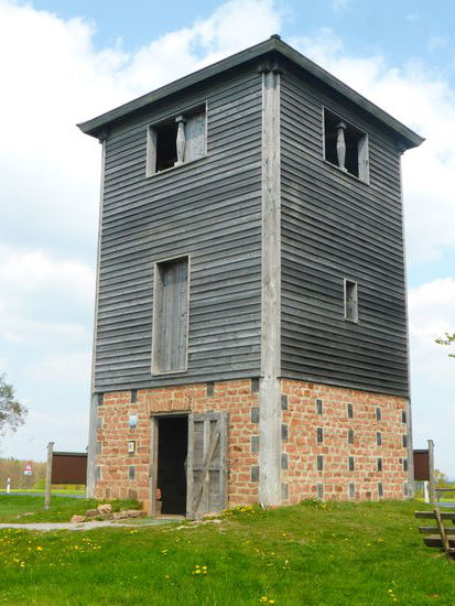 Die originalgetreue Nachbildung eines Limes-Wachturmes bei Vielbrunn ist dagegen weithin sichtbar. Am und im Turm informieren Infotafeln in Wort und Bild über Bau und Funktion des Wachturmes sowie über das Leben am Limes. Rekonstruierte Palisaden der befestigten Grenze des einstigen römischen Reiches befinden sich gegenüber vom Turm.