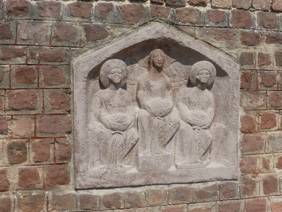 Das Matronenbild links ist die Nachbildung eines Steinreliefs, das in der Bergkirche in Mümling-Grumbach eingemauert ist. Es ist Zeugnis eines germanisch/keltischen Kultes in der römischen Provinz am Niederrhein. Wie bei vielen Matronensteinen wurde im Zuge der Christianisierung das Gesicht der mittleren, jungen Matrone zerstört. Man ging davon aus, daß es sich um eine heidnische Darstellung handelte gegenüber den beiden „Heiligen" rechts und links. Mit freundlicher Genehmigung des Darmstädter Landesamtes für Denkmalschutz wurde in dieser Nachbildung das Gesicht der jungen Matrone rekonstruiert.