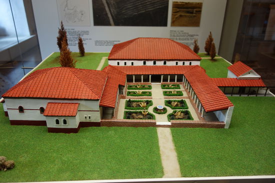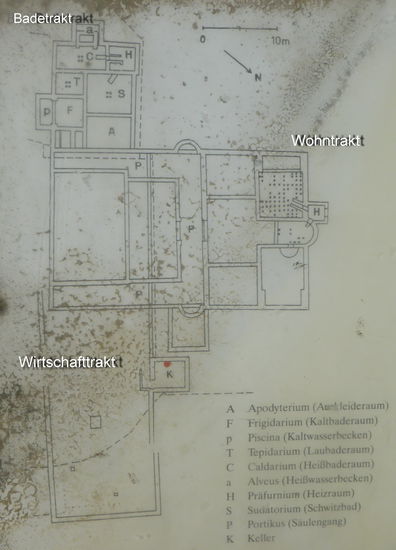 Damals stand hier eine repräsentative Villa mit einem Grundriß, der sich von dem eines römischen Bauernhofs unterschied. Die großen Räume mit dem Mittelsaal mit Apsis die anschließende dreiseitige Portikus mit den beiden Apsiden, die einen Gartenhof begrenzt, und das großzügige Badgebäude, das durcll die Portikus mit dem Haupthaus Verbunden ist, sind architektonisch anspruchsvoll und erinnern an die großen römischen Villen westlich des Rheins.