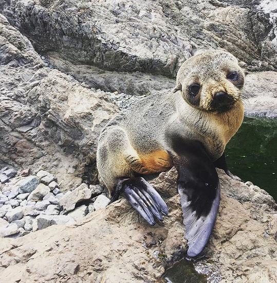 Die letzten Kilometer geht es über eine Schotterstraße entlang der Küste. Überall sind Seelöwen zu sehen die sich auf den Steinen sonnen oder im Wasser planschen. Und das tolle, man kommt wirklich nah an sie heran ohne dass sie sich gestört fühlen.