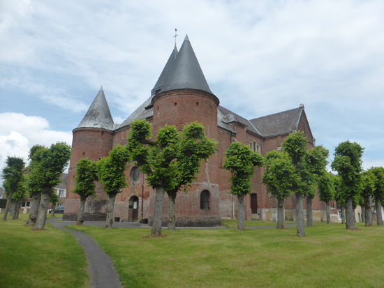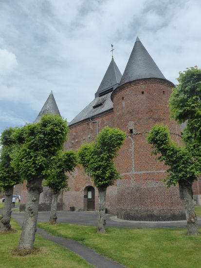 Die Kirche Saint-Christophe de Rocquigny liegt etwas versteckt hinter dem großen Dorfplatz und ist umgeben von zahlreichen kunstvoll beschnittenen Bäumen.