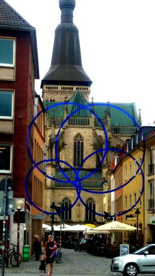 Bei der Marienkirche und den umliegenden Häusern waren blaue Bänder auf die Fassaden aufgeklebt. Wenn man den richtigen Punkt gefunden hatte, ergab es ein 3D Bild, mit Kirche, Häusern und darin eingebettet blaue Kreise, sehr interessant. Das ist in unseren Augen wahre Kunst so etwas herzustellen.