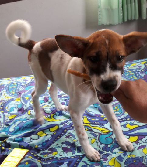 Der kleine Welpe hat "Distemper" = Staupe und musste von allen anderen separiert werden. In einem extra Zimmer freut er sich jedes mal, wenn man vorbei schaut und noch mehr, wenn man einen Kauknochen mitbringt.