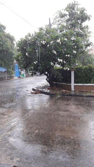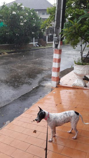 Gestern Nacht hat es stundenlang geregnet und überall steht nun das Wasser. Ich begebe mich mit Batman auf die Zentimeter hoch "gefüllte" Straße mit leckerem Regenwasser - findet jedenfalls Batman .