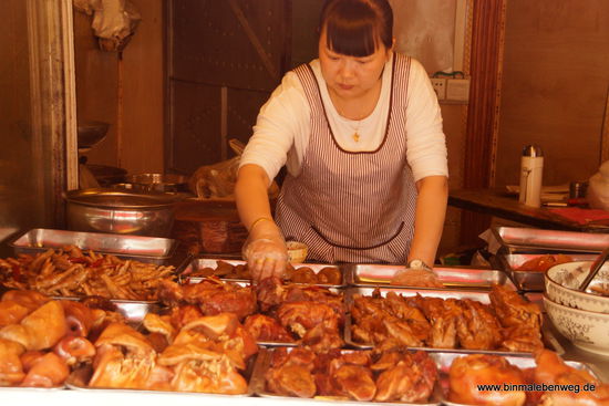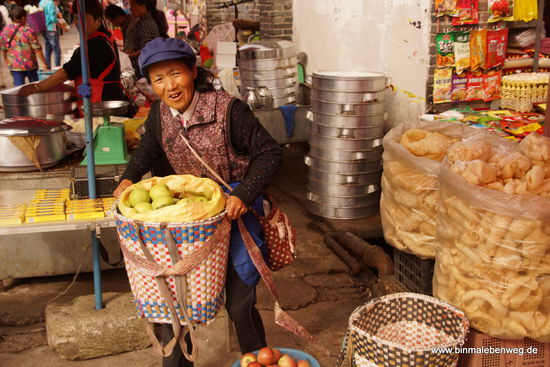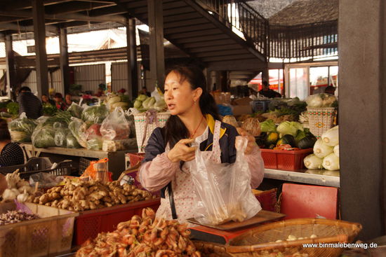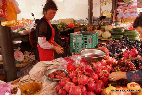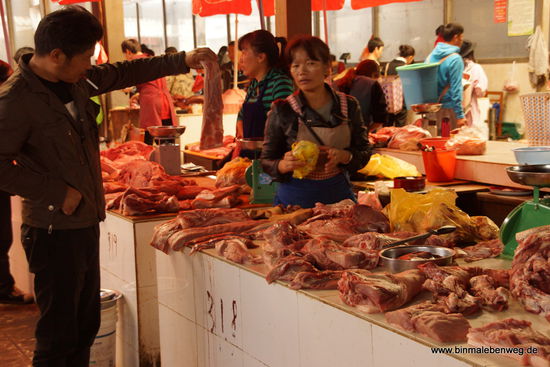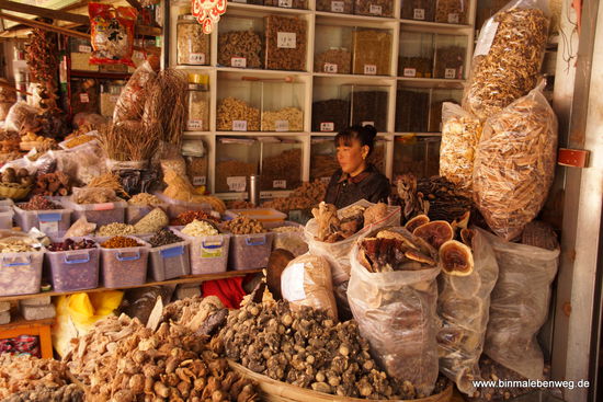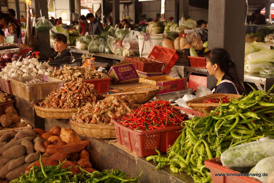 So auch der Zhongyi-Markt in Lijiang. Hier gibt es nicht nur Obst, Gemüse und Pilze, sondern auch Kupferwaren oder lebendiges Vieh. Unglaublich diese Vielfalt. Manches macht richtig Appetit, anderes weniger. Hier kaufen nicht nur die Hausfrauen ein, sondern auch die Restaurants.