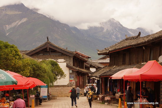 Auch im Dorf Baishazhen am Fuße des Jadedrachen-Schneeberges erahnt man den Berg leider nur. Auch hier sind die Naxi zu Hause. Baisha war, bevor Kublai Khan es annektierte und es in das Yuan-Reich eingliederte, die Hauptstadt des Naxi-Königreiches. Die Naxi-Minderheit befand sich traditionell immer im Spannungsverhältnis zwischen den militärisch überlegenen Tibetern aus dem Norden und den ebenfalls überlegenen Bai aus dem Süden. Das Stadtbild ist geprägt von den zahlreichen authentischen Innenhof-Häusern aus der Qing-Dynastie. Hier wohnen auch heute noch viele Menschen, die Häuser wirken oft ziemlich abgewohnt.