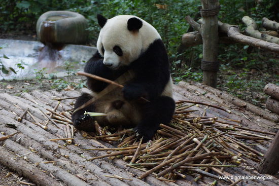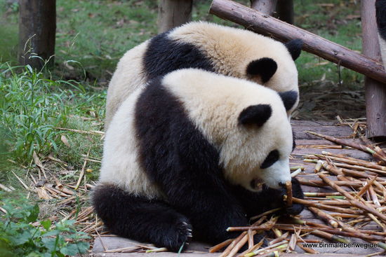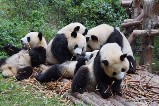 Apropos stinkfaul: Sie sind unglaublich wählerisch, welche Teile von den 40 Bambusarten sie wann verspeisen. Jeden Tag essen sie 15 bis 20 Kilogramm Bambus und hinterlassen einen Berg Abfall von mehreren Metern Höhe. Wenn sie ein Fünftel der jeweiligen Bambusstange essen, wäre das viel, ist eher weniger. In der Aufzuchtstation haben sie Vollpension mit Bedienung, im Falle einer Auswilderung müssten sie sich mit Selbstbedienung vorlieb nehmen. Irgendwie sind sie ja schön süß...