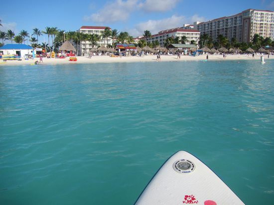 Palm Beach liegt an der Westküste und ein in Richtung Meer wehender Wind in dieser Stärke ist für (erfahrene) Kite-Surfer wohl ideal, auf dem Paddelboard ist der meist seitliche Wind recht anstrengend. Da trifft es sich gut, dass die großen Hotelkomplexe einen beachtlichen Windschatten produzieren. So gelange ich etwa bis zur Mitte des Palm Beach.