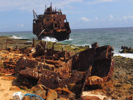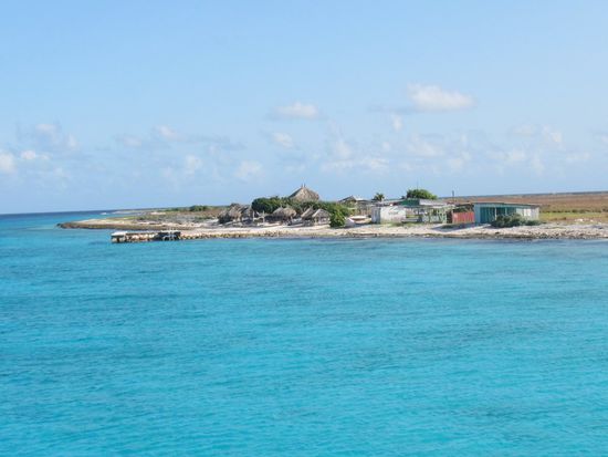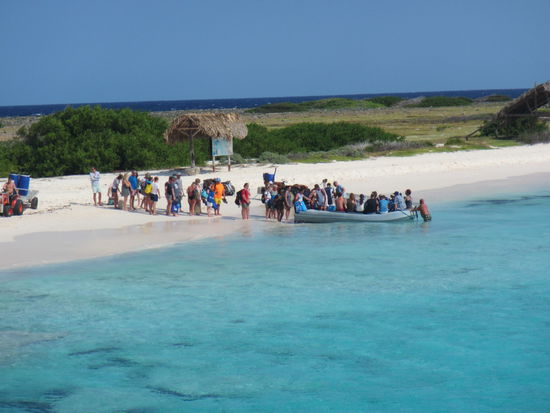 Die Fahrt nach Klein Curacao dauert etwa zwei Stunden. Nach der Ankunft gibt es zunächst Frühstück, anschliessend kann jeder den Aufenthalt nach eigenen Vorstellungen gestalten. Ich mache mich auf zu einem Inselrundgang zum alten Leuchtturm und mehreren Wracks.