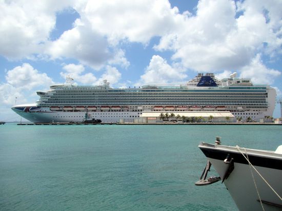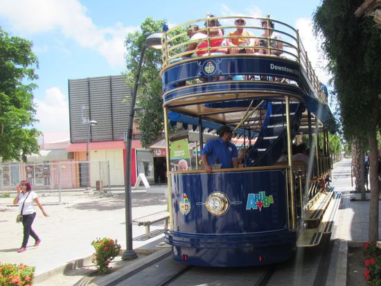 Den Rest des Tages sehe ich mir die Hauptstadt Oranjestadt an. Eine originelle Straßenbahn verbindet das Stadtzentrum mit dem Kreuzfahrt-Terminal. Dort liegen gerade zwei der Riesen vor Anker.