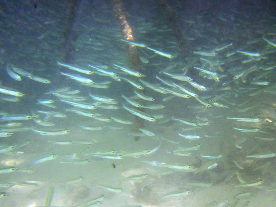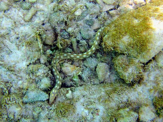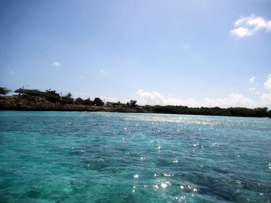 Südlich von Oraniestaad liegt der Mangrel Halto Beach. Hier kann man gut in Ufernähe parken. Ministrände wechseln sich ab mit Mangrovenwald. Mit dem Paddelboard starte ich in nördlicher Richtung. Die hohen Uferfelsen geben einen ganz guten Windschutz ab. Bald kommt die Spaans Lagoon in Sicht, eine in das Landesinnere führende Lagune. Leider kommt hier schon bald eine Straßenbrücke mit zu niedrigen Durchlässen, da heißt es Umkehren. Den Rest des Vormittags verbringe ich mit Schnorcheln und Schwimmen am Mangrel Halto Beach. Interessanteste Entdeckung ist eine kleine gefleckte Muräne.