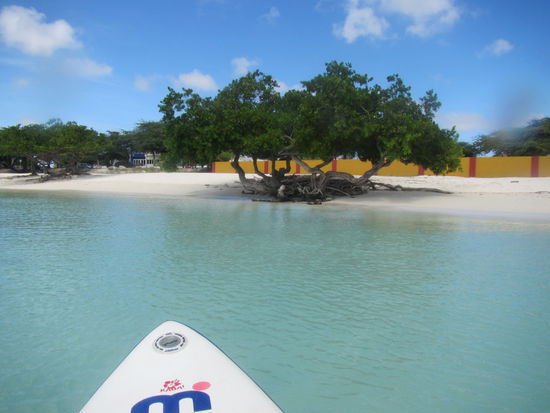 Lunch gibt es in einem Cafe am Nordende von Oraniestaad. Danach geht es zum Linear Beach südlich der Stadt, aber noch vor dem Mangrel Halto Beach. Hier sind genügend Parkmöglichkeiten direkt am Wasser. Mit dem Paddelboard paddle ich dann am Strand entlang und wieder zurück. Die für Aruba charakteristischen Divi-Divi-Bäume sind als Schattenspender bei einer Rast am Ufer willkommen.
