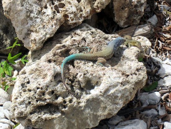 Nun möchte ich mich noch bei einem Bad abkühlen. Sandstrände sind auf Bonaire eher rar, aber in der Nähe des Airports gibt es den Strand "18th Palm". Der gehört eigentlich zu einem Resort, man kann aber trotzdem dahin und auch Parkmöglichkeiten gibt es (wie eigentlich überall auf Bonaire) reichlich. Gut schwimmen und schnorcheln kann man von einem schwimmenden Pier aus. Am Parkplatz nehmen gerade farbenprächtige Eidechsen ein Sonnenbad.