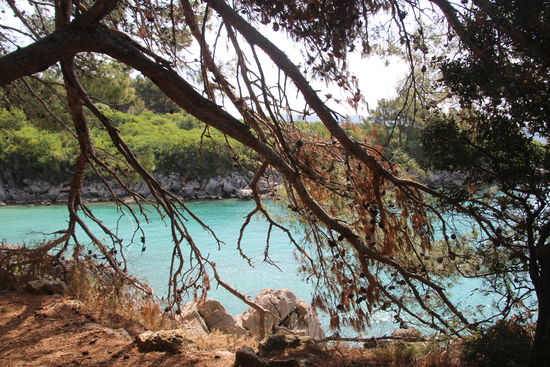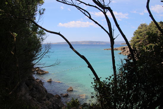 Ein malerischer kleiner Pfad zwischen Bäumen und mit teilweise größeren Felsen führt an der Bucht entlang. Immer wieder gibt es Blicke auf das Wasser, die zum Fotografieren einladen.