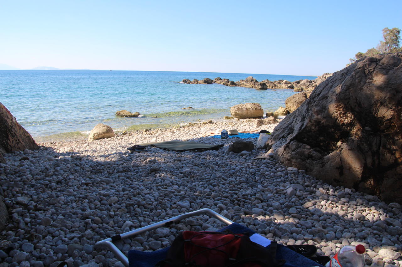 Ein Platz am Rande der Felsen - heute mit Liege, mein Buch, der MP3-Player mit Musik, eine Flasche Wasser, etwas Käse und Brot. Badeschuhe habe ich auch dabei, damit tut man sich leichter, ins Wasser zu gehen. Das ist kristallklar und wie schön: mal ein kleines Stück Land und Wasser ohne Müll.