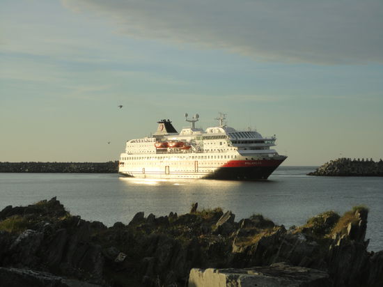 Abends erleben wir das „Tageserlebnis“ ... immer zwischen 22h und 22h15 kreuzen sich das südwärts wie auch das nordwärts fahrende HurtigrutenSchiff vor der Hafeneinfahrt, begleitet durch minutenlanges Hupen der beiden Schiffshörner.