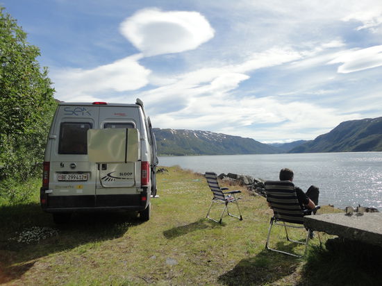 Heute hatten wir vor auf die Insel Sørøya weiterzufahren, dies jedoch nach Ansicht der Wetterprognosen wieder verworfen. So fahren wir nur zum Fähranleger in Øksfjord und gleich wieder weiter. Kurz darauf umfahren wir den kurzen Tunnelabschnitt auf der alten jHauptstrasse und entdecken einen wunderschönen Platz direkt am Fjord, eben, kein Verkehr und mit Feuerstelle. Da es erst kurz nach 11 Uhr ist haben wir noch genug Zeit für gemütliches Nichtstun..! Die Sonne hat uns auch wieder und es ist herrlich warm. Um dem heutigen Sonntag noch mehr zu entsprechen backen wir einen NussSchoggiKuchen auf dem Omnia zum Nachmittagskaffee.