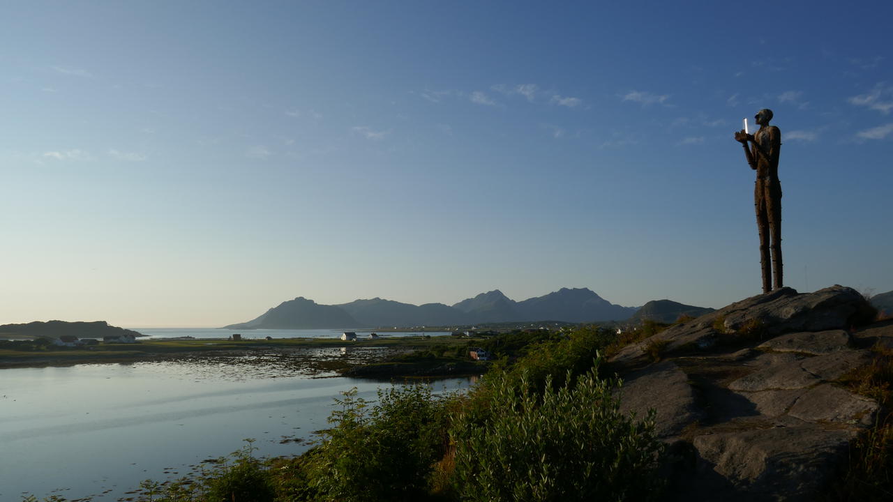 Am nächsten Tag ziehen wir weiter, auf der Westküste Andøyas südwärts, auf der Suche nach der Sonne. Auf halber Strecke bei Sortland haben wir die Sonne eingeholt, und geniessen die Fahrt die uns weiter über Sortland (Langøya) bis nach Bø (Langøya) führt, wo wir auf einen kleinen Stellplatz beim kleinen Bootshafen treffen. Gegen eine kleine Abgabe dürfen wir dort stehen bleiben, Strom und Frischwasser benutzen. Markus erkundet die lokalen Fischgründe und Tena und Aurinko begaffen die örtlichen Geschehnisse bei den Motorboten. Abends werfen wir die Bordkombüse an und können endlich mal wieder draussen essen. Danach entdecken wir auf dem Abendspaziergang auf der anderen Seite des Hügels den „Skulpturlandskap“, einen Teil einer Outdoor-Skulpturausstellung, entlang der nordnorwegischen Küste. Uns beschert sie vor allem einen sensationellen Ausblick auf einige vorgelagerte Schären.