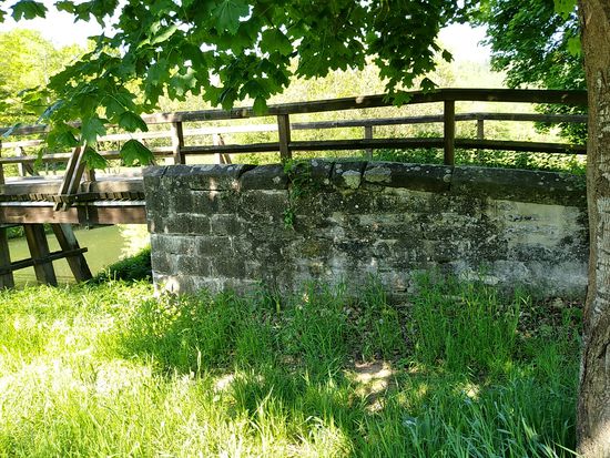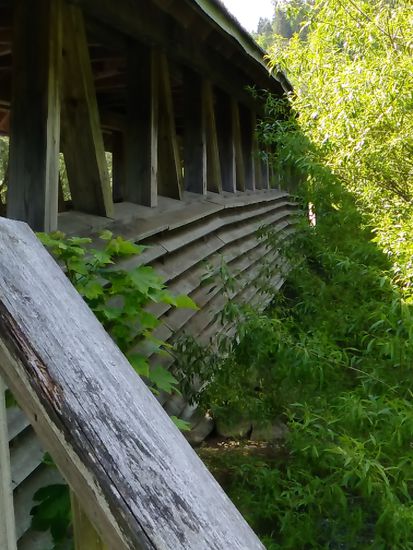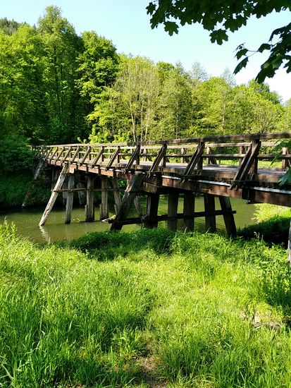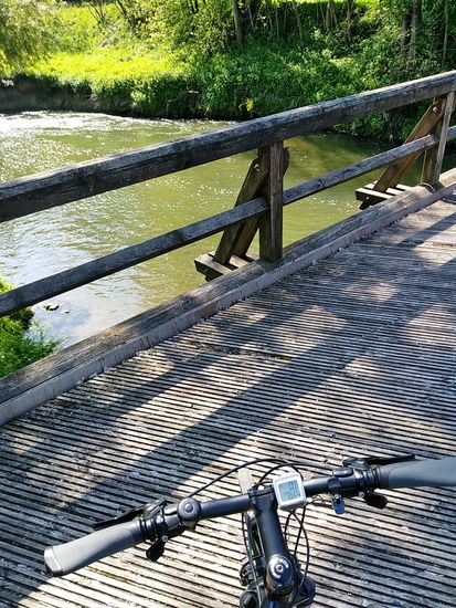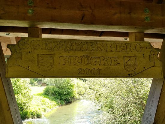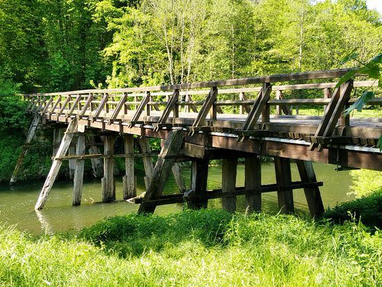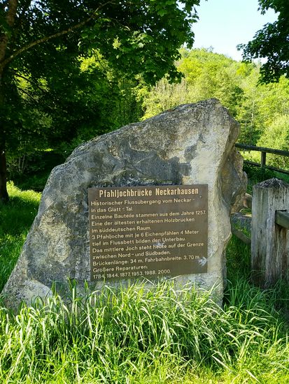 Ebenfalls gleich bei Neckarhausen eine 37 m lange historische Pfahljochbrücke aus dem Jahre 1780 über den Neckar, eine der ältesten Brücken Süddeutschlands. Sie lag zwar nicht direkt auf meinem Weg, aber da das mittlere Joch an der Grenze zwischen Nord- und Südbaden liegt, ließ ich mir die Gelegenheit für eine "historische" Fahrt über die Brücke und wieder zurück dann doch nicht entgehen. In der Folge noch einige Bilder dieser Brücke.