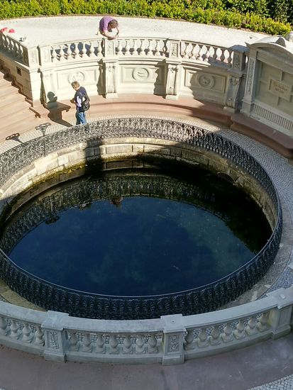 Über einen Aufzug neben der Kirche Heilige Dreifaltigkeit kann man bequem mit dem Rad das einige Meter tiefer liegende Parkgelände mit der rund gefassten Donauquelle erreichen.