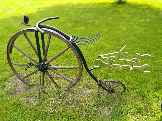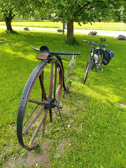 In Hintschingen kurz vor Immendingen gab's dann noch ein Generationentreffen hinsichtlich 200 Jahren menschlicher Fortbewegung auf Rädern ohne fremde Kraft, wobei das linke historische Gefährt ja selbst schon einen technischen Fortschritt zur eigentlichen Drais'schen Laufmaschine aus dem Jahre 1817 darstellt.