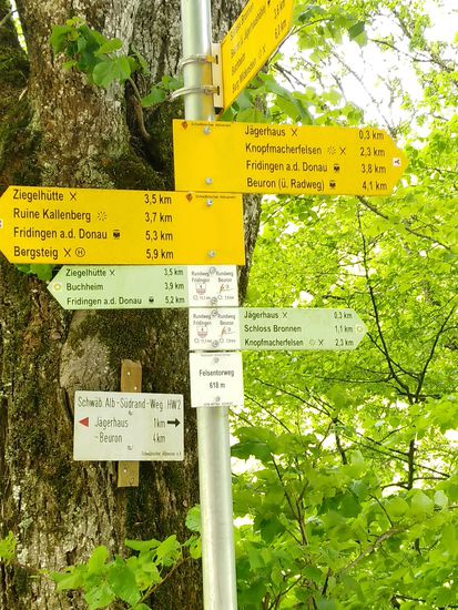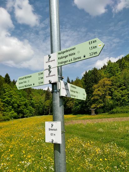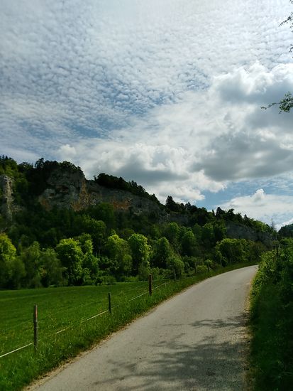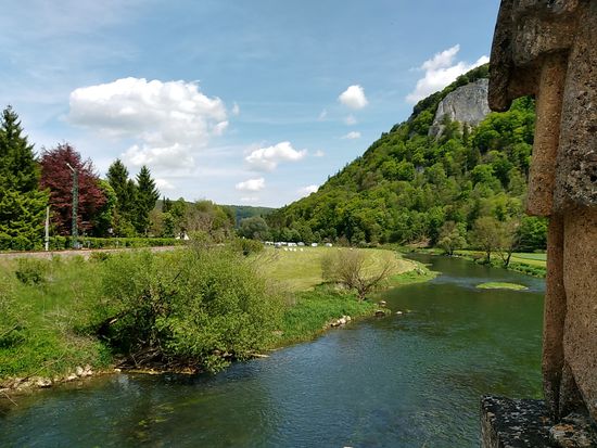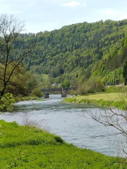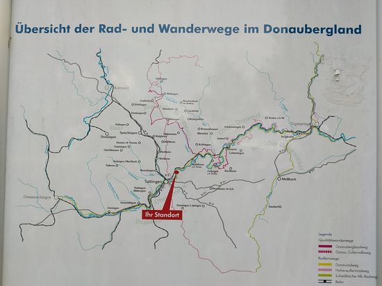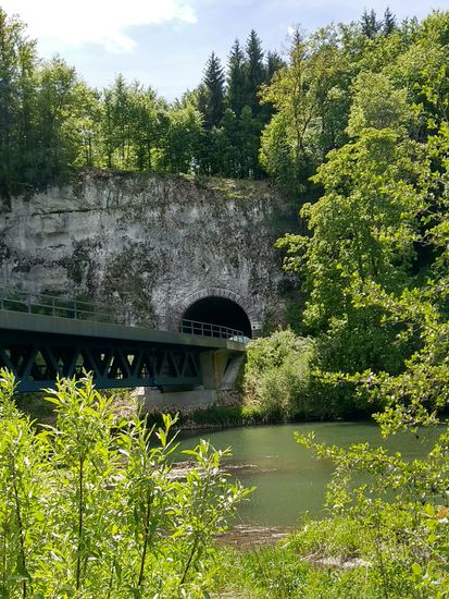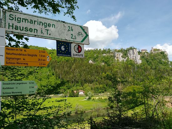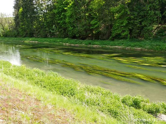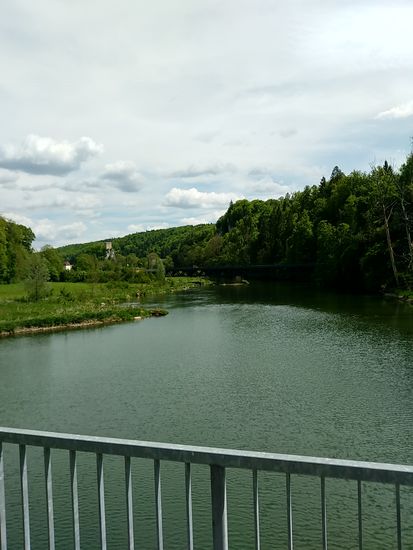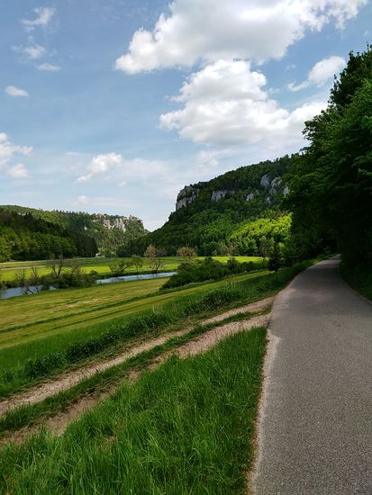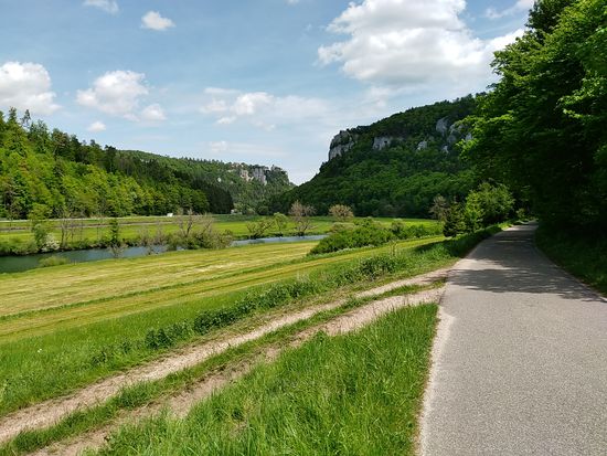 Eigentlich wäre ich darauf gespannt gewesen, die Donauversinkung bei Immendingen live zu erleben, wenn das Wasser zum Großteil oder auch ganz im Boden verschwindet, Aber zu meinem Zeitpunkt des Vorbeikommens am 23. Mai war die Wasserführung der Donau so hoch, daß man nicht im Geringsten von einer Versinkung hätte reden können. Die Donau strömte frisch und munter so dahin und ich rollte neben ihr weiter.