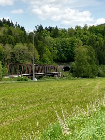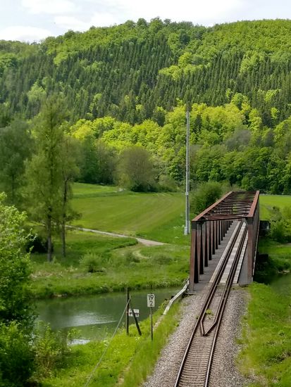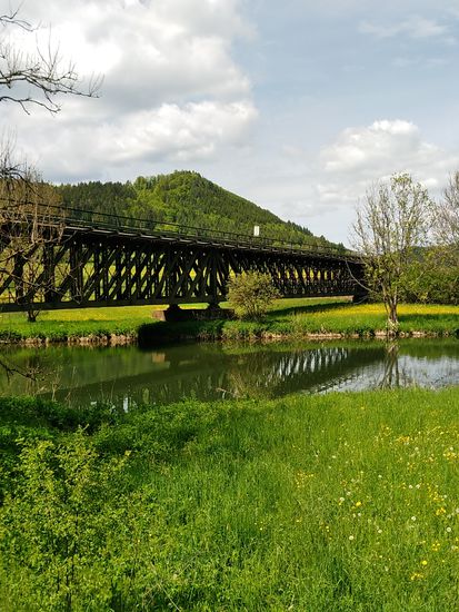 Eisenbahn-Stahlfachwerkbrücke bei Fridingen an der Donau und im folgenden Landschaftseindrücke vom Donautal bis zur Ortschaft Fridingen.