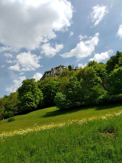 Im Hintergrund auf dem Felsen: Burg bzw. Schloss Bronnen.