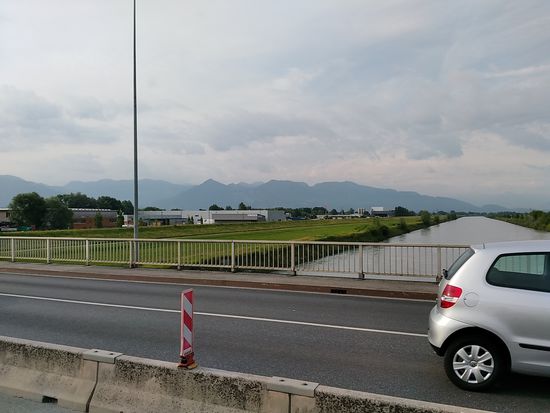 Etwa vom ersten weiter oben gezeigten Baggersee bis Bludenz war ich mit einem frisch absolvierten Bachelor aus dem westlichen Kölner Raum unterwegs, der, bevor er mit dem Master weitermachen wollte, seine überhaupts erste Radferntour unternahm. Von Stuttgart aus losgeradelt wollte er für's Erste bis Rom radeln und dann je nach Verfassung entweder mit dem Zug oder weiterhin per Fahrrad nach Sizilien gelangen und dort einen vorübergehenden Job suchen, bis es wie schon gesagt mit dem Master-Studium weitergehen sollte.