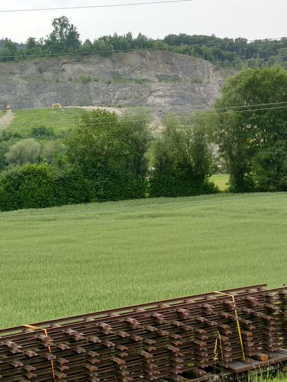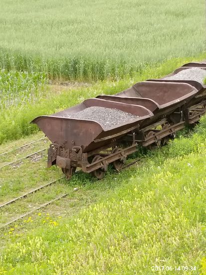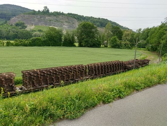 Das Wagenmaterial in Form von Kipploren und Gleisrost-Aufliegern gehört allem Anschein nach zum im Hintergrund sichtbaren Steinbruch.