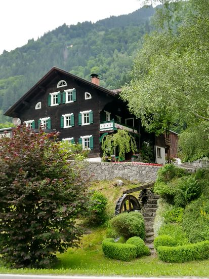 Nach anfänglichen Schwierigkeiten bei der Abfahrt von der Unterkunft aufgrund meines momentan nicht reagierenden Tachos, was mich eine knappe Viertelstunde an Zeit kostete, kam schon bald am Stadtrand von Bregenz die Überquerung der Bregenzerach, die hier im Hintergrund in den Bodensee mündet. Dieser knapp 70 km lange Fluß entspringt oberhalb von Schröcken (Gebiet bei Lech am Arlberg) auf 2400 m Höhe ü.A. (über Adria), entwässert fast den kompletten Bregenzerwald und ist besonders im Oberlauf durch seine starke Wildwasserführung für versierte Sportler sehr interessant. Nach 2005 m Höhendifferenz mündet die Ach auf 395 m ü. A. wie gesagt in den Bodensee.